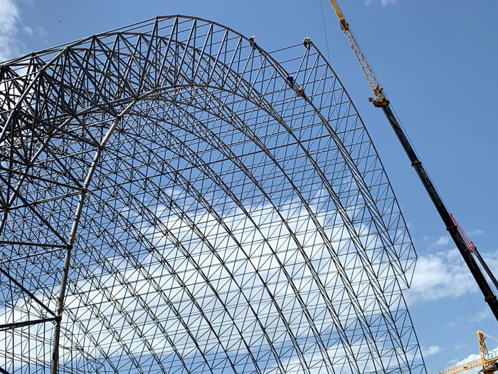 (2)网架加工前应对现场尺寸进行复测,确认无误后方可进行加工、安装;网架制作、运输、安装应遵守《空间网格结构技术规程》JGJ7-2010、《钢网架江苏螺栓球节点》JG/T 10-2009、《钢网架江苏螺栓球节点用高强度螺栓》 GB/T 16939-2016、《江苏钢结构江苏工程江苏施工规范》 GB50755-2012、《江苏钢结构江苏工程江苏施工质量验收标准》 GB50205-2020。